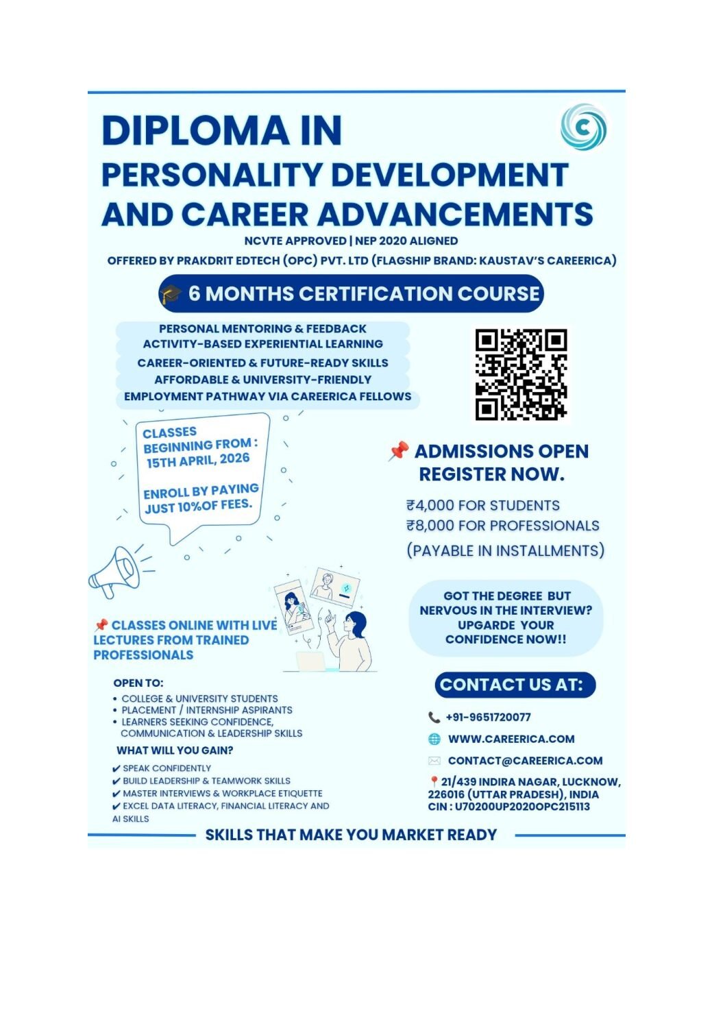 Got the degree but still nervous in interviews? It’s time to upgrade your confidence, personality, and career potential. ENROLL NOW!!